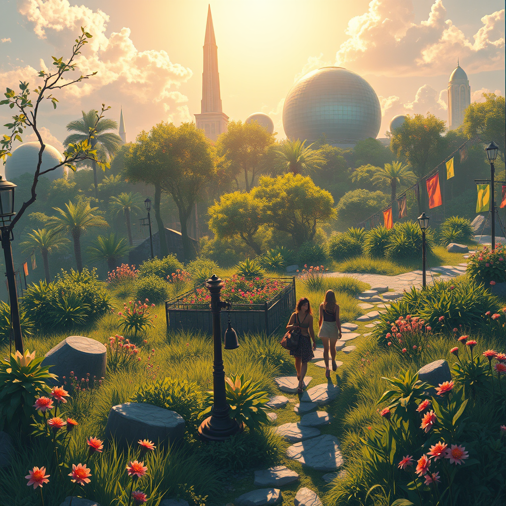 Beautiful anime painting of a serene solarpunk day in summer, envisioned by the styles of Tim Okamura and Victor Nizovtsev, with influences from Greg Rutkowski and Noah Bradley. This masterpiece is trending on ArtStation, rendered in vibrant 8k detail, blending graffiti elements with fine intricate details. A kaleidoscope of colors dances across the scene, with the composition capturing the essence of the golden ratio. Lush greenery is interwoven with advanced technology, glowing softly under the sun's embrace, as characters move leisurely through this utopian landscape.