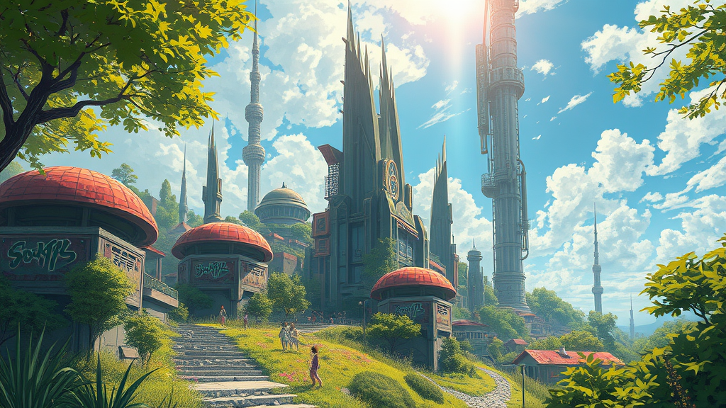 Beautiful anime painting of a solarpunk summer day, inspired by the styles of Tim Okamura, Victor Nizovtsev, Greg Rutkowski, and Noah Bradley. Trending on ArtStation, depicted in 8k resolution, this masterpiece is full of vibrant, intricate details and vivid colors. The scene captures an idyllic world where nature and technology harmoniously coexist, characterized by lush greenery and futuristic architecture, all under a bright summer sky. The art showcases a blend of graffiti-like exuberance with delicate, painterly finesse, incorporating the elegance of the golden ratio. Despite minor creative liberties taken to add an abstract twist, the essence of a peaceful, inspiring solarpunk vision remains intact.