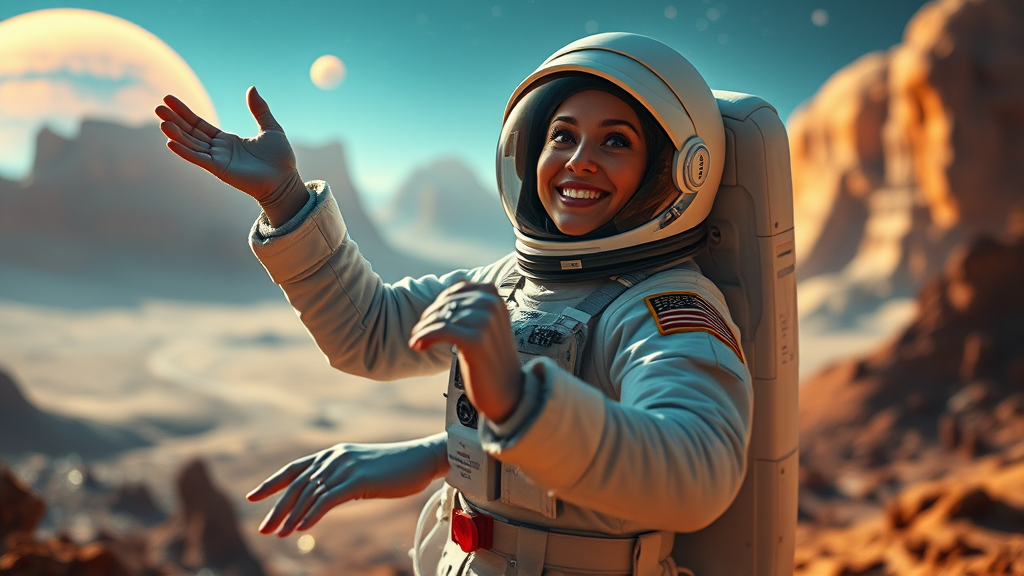 Beautiful astronaut gracefully dancing and smiling with perfect eyes against an exotic alien landscape, cinematic masterpiece with stunning lighting, capturing the wonder and joy of exploration, an enchanting scene evoking a sense of adventure and discovery.