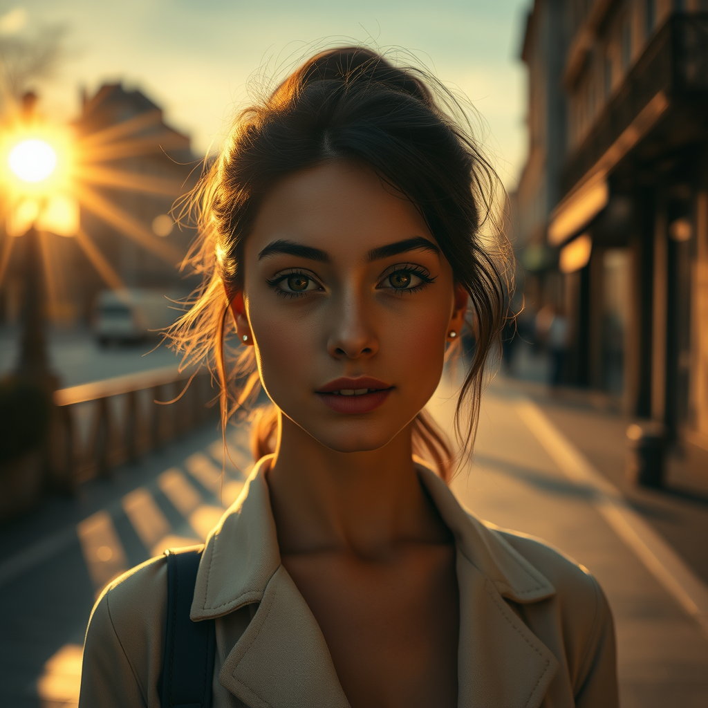 Beautiful candid portrait of a charming young woman in Paris during sunset, featuring radiant light rays, high-resolution, and detailed facial features with sharp focus. The aesthetic captures intricate detail in her eyes, skin, and fashionable attire, enhanced by an octane-rendered, ultra-realistic style. The photograph employs realistic shadows and natural skin texture for lifelike photorealism, shot in 8K UHD with a cinematic quality. Using a Sony Alpha 1 with an 85mm lens at f/1.4 GM, the image achieves a smooth, focused look, showcasing a toned physique and perfect face. Captured in a symmetrical and center-framed composition, the setting includes a touch of urban elements like metal and gentle dust, with refined specular lighting and shallow depth of field for a striking visual.