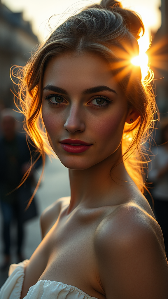 Beautiful candid shot of a young 24-year-old Russian woman in Paris during sunset, featuring radiant light rays, captured in high resolution. The image highlights detailed facial features, sharp focus, and aesthetic elegance. The scene is bathed in realistic shadows and natural skin texture, exemplifying photorealism. Shot using a Sony Alpha 1 with an 85mm lens at f/1.4 GM, the focus is hard while maintaining a cinematic film still quality. The composition is center-framed and symmetrical, showcasing an intricate and elegant appearance. The model displays a toned physique with perfect facial features. The photograph employs techniques like raytracing and specular lighting with a shallow depth of field. It avoids imperfections like extra limbs or bizarre anatomy to ensure a smooth, ultra-realistic image without watermarks or text.