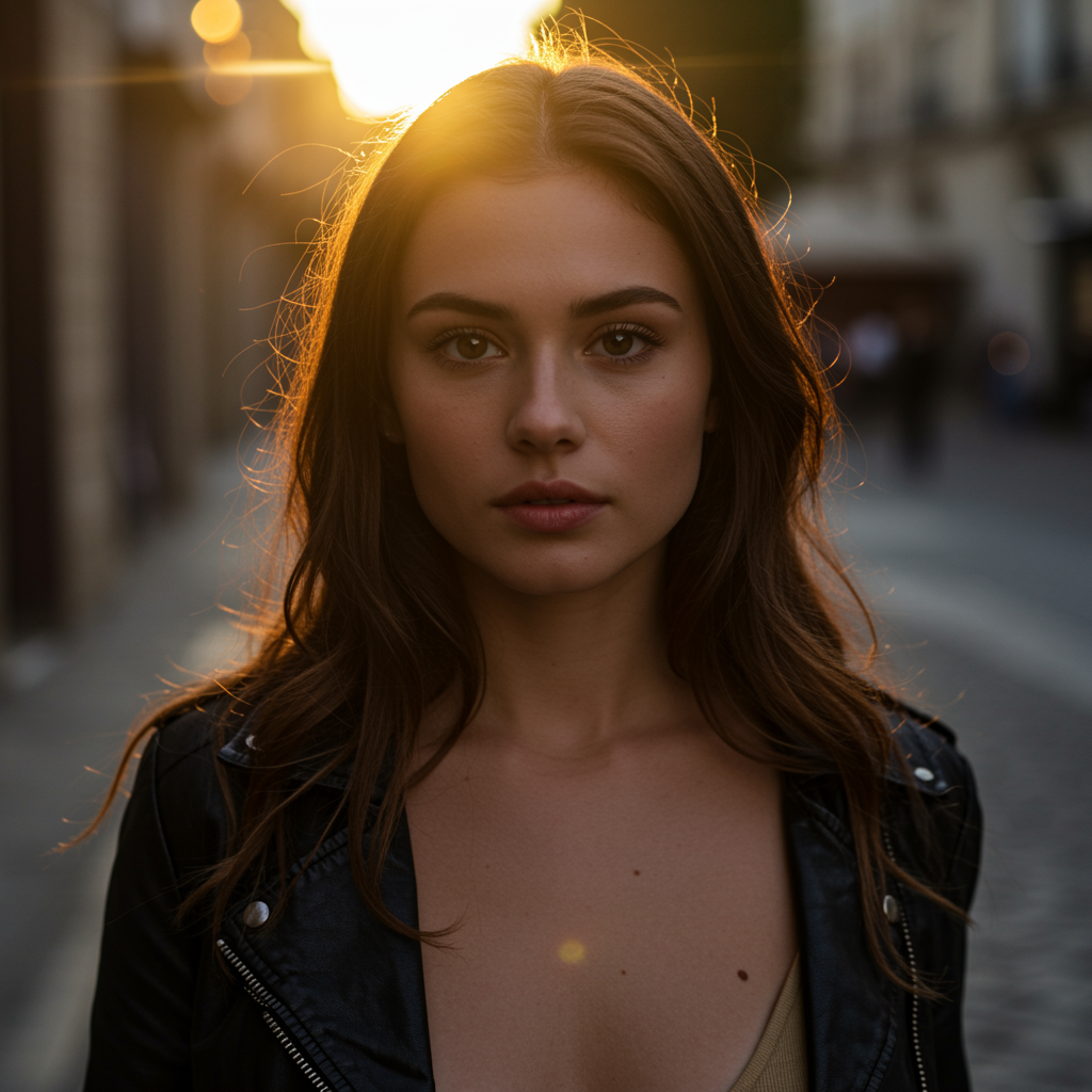 Beautiful candid shot of a young woman in Paris at sunset, with radiant light rays and high-resolution detail. Her facial features are intricately detailed, with sharp focus and realistic shadows. Her skin and clothing are depicted with ultra-realism, capturing natural textures and tones. The image showcases a symmetrical composition, highlighting her elegant and toned physique. Photographed on a Sony Alpha 1 with an 85mm lens at f/1.4, the scene is cinematic and resembles a film still. The lighting uses raytracing techniques to enhance the photorealism, with a shallow depth of field that brings focus to her expressive eyes. The setting is free of visual distractions, maintaining a realistic and seamless aesthetic. This image captures the essence of a fashion model in a serene moment, embodying grace and beauty in the heart of Paris.