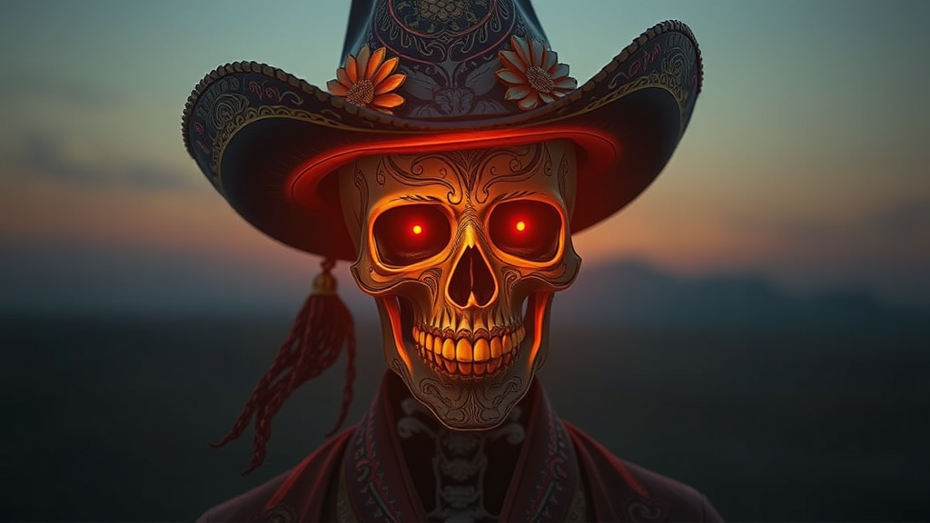 Beautiful cinematic photograph of a calavera catrina with a cowboy hat, rendered in the style of a Rembrandt oil painting. This masterpiece seamlessly blends elements of feudal Japan with cyberpunk aesthetics, utilizing precise lineart to create an intricate and highly detailed composition. The design exudes a minimalist yet realistic appeal, akin to concept art worthy of an Artstation feature, captured in stunning 8k resolution. The resulting image is both enchanting and captivating, showcasing artistic mastery with balanced proportions and harmonious colors.