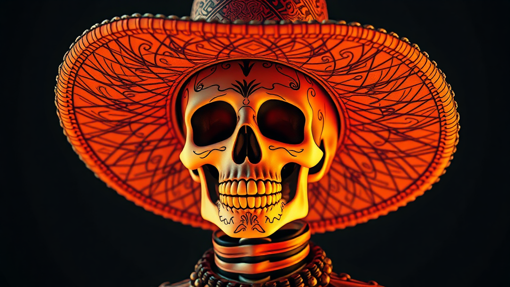 Beautiful cinematic photograph of a calavera catrina wearing a cowboy hat, inspired by Rembrandt oil paintings, with elements of feudal Japan design. It features precise line art with a touch of cyberpunk aesthetics. The image is minimalist yet intricate, highly detailed, and rendered in 8k resolution, reflecting realistic concept art. The creation embodies a harmony between tradition and modernity, capturing the essence of timeless art with a futuristic twist.