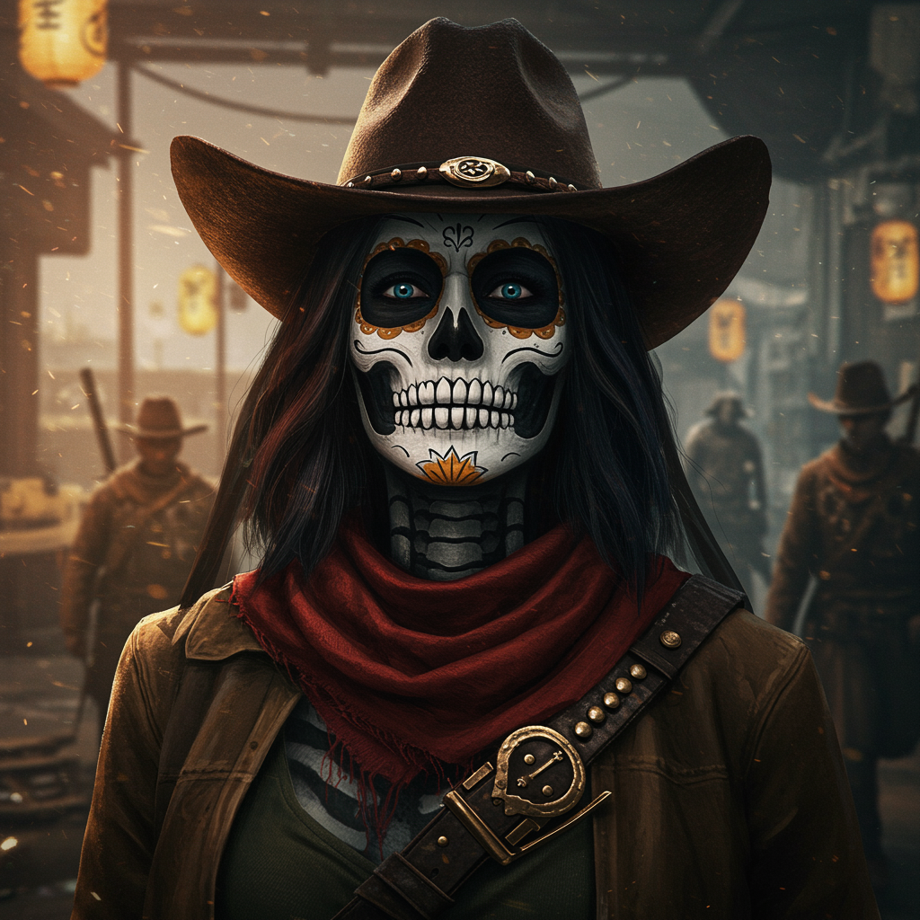 Beautiful cinematic photograph of a calavera catrina wearing a cowboy hat, rendered in the style of a Rembrandt oil painting. The scene is set with elements of feudal Japan, incorporating precise line art into a cyberpunk context, achieving an 8k resolution. The artwork embodies a minimalist aesthetic yet remains intricate and highly detailed, focusing on realistic concept art akin to an ArtStation showcase. The composition eschews unnecessary embellishments like tiling, poor renderings, or disproportionate features, ensuring a cohesive and harmonious visual narrative.