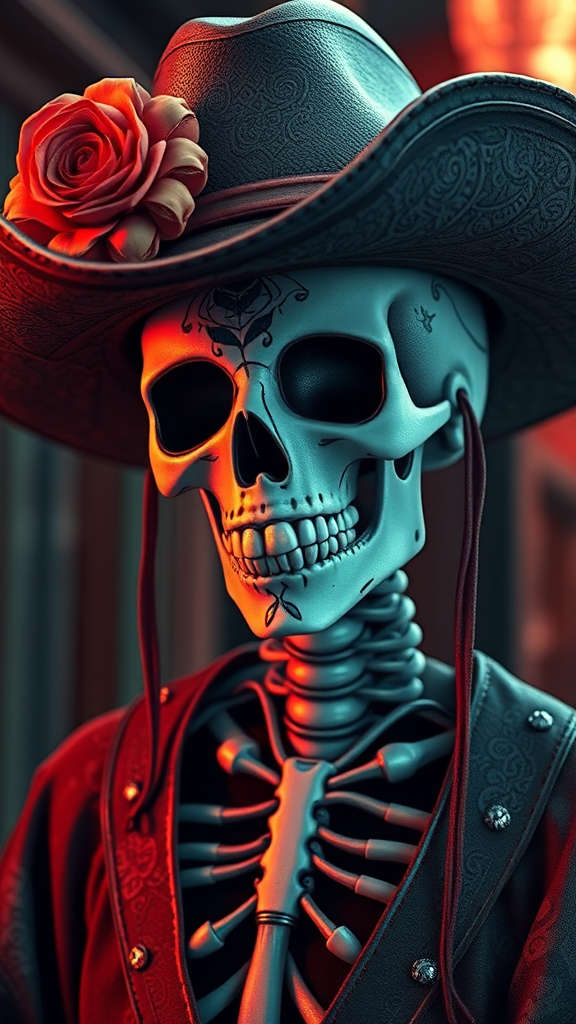 Beautiful cinematic photograph of a calavera catrina wearing a cowboy hat, inspired by Rembrandt oil painting, with elements of feudal Japan and precise line art. The composition features a cyberpunk aesthetic with minimalist yet intricate and highly detailed concept art. Rendered in 8k resolution, it exhibits realistic qualities akin to an ArtStation model. The scene avoids elements such as tiles, tiling, logos, watermarks, or any indication of bad artistry like blurriness, deformation, or poor anatomy. Characters are well-proportioned with no extra limbs or disfigured features. No unnecessary duplication or morbid hues are present, ensuring clean lines and clarity akin to a gallery-worthy artwork.