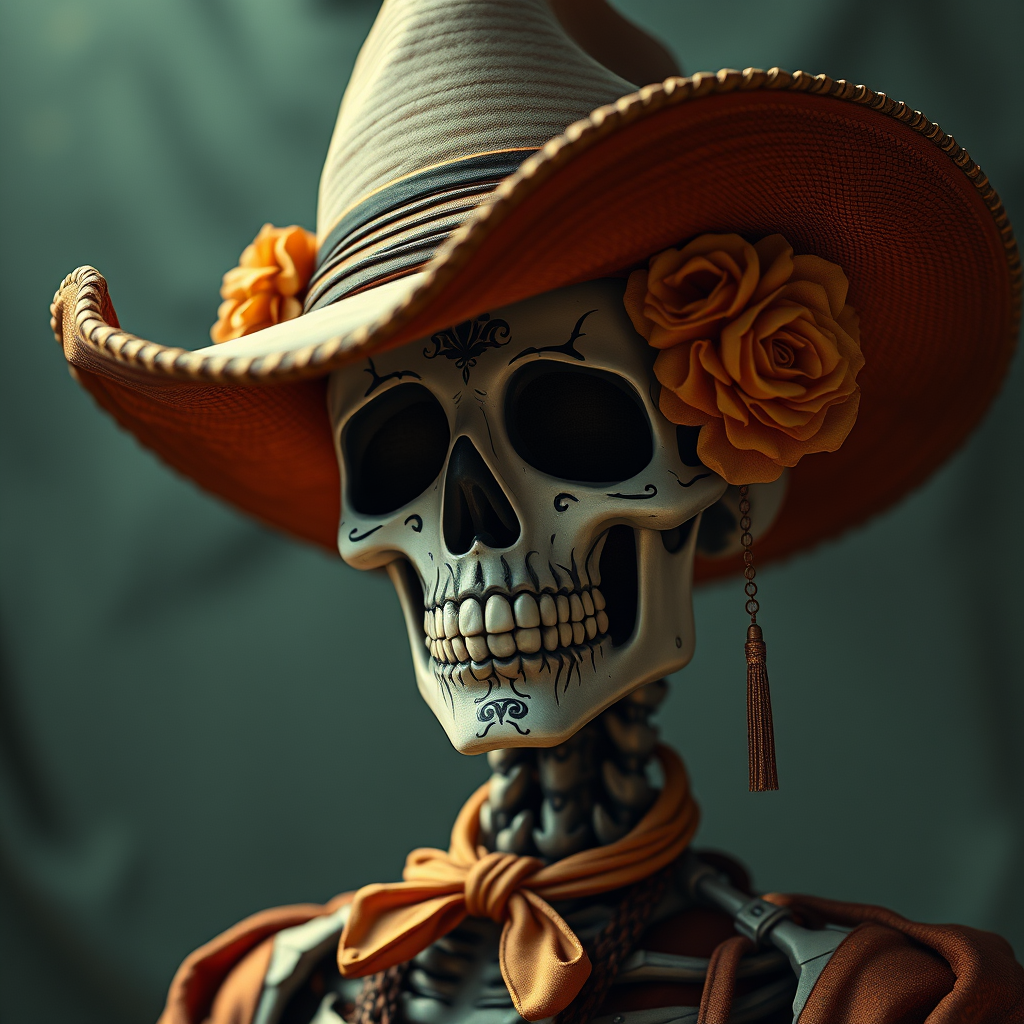 Beautiful cinematic portrait of a calavera catrina wearing a cowboy hat, capturing the essence of a Rembrandt oil painting with influences from feudal Japan. The artwork features precise line art and a cyberpunk aesthetic in 8k resolution, combining minimalist and intricate details. The concept art is realistic and suitable for platforms like ArtStation, focusing on a fusion of cultural styles with a highly detailed and imaginative style.
