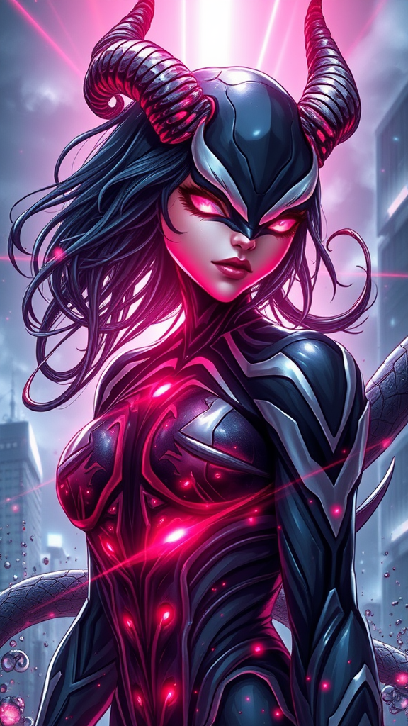 Beautiful demon girl fused with symbiote, inspired by Tsutomu Nihei, showcasing Marvel and Venom elements, in a futuristic sci-fi setting with hyper-detailed features, centered laser and beams from the sky, with energy clots and accelerated light flashes capturing speed. The scene displays ultra-detailed drawing, rich in particles and fusion, with symmetrical composition in 8k comic graphics. It highlights contour lighting, depth of field, and spotlight effects from a first-person perspective, presented in HD super-resolution.