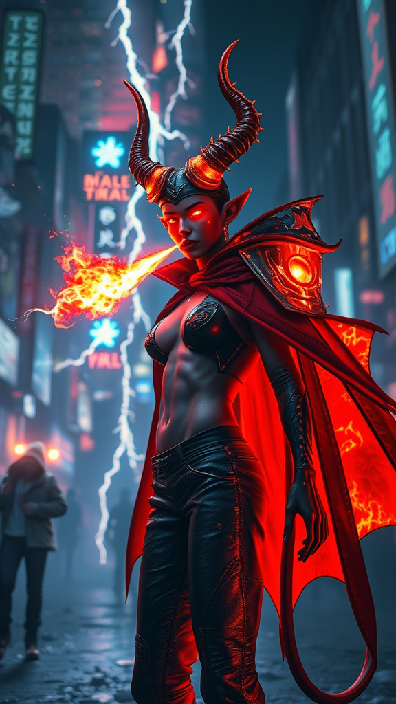 Beautiful devil from hell, adorned in a cape of fire, with perfect proportions reminiscent of Cyberpunk Edgerunner style, captures attention. Set late at night, the figure breathes fire amidst cold chaos, creating strong contrasts. From a distant view, the scene is rendered in stunning 8K picture quality, shimmering with a delicate touch. Influences of Loish and Jeremy Mann shine through in this full body shot, resembling a character sheet. A lightning wave effect highlights the scene, blending 3D and CGI elements. The character's glowing neon features contrast with a sleek streetwear outfit, set against a vibrant neon city. The scene avoids duplication, blur, and abstraction while maintaining clarity and focus. The character is skillfully depicted, avoiding disfigurement, deformation, and cartoonish elements, achieving a harmonious balance without distortions or extra limbs. The vibrant colors are well-saturated, avoiding graininess or poor anatomy, and the form is well-proportioned with nothing missing or cut-off. The overall composition is engaging and free from cloned faces or missing parts, capturing a sense of dynamic movement within a neon-lit urban landscape.