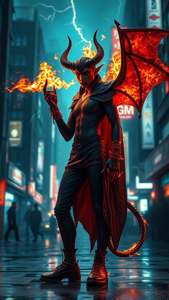 Beautiful devil from hell with a cape of flickering fire, showcasing perfect proportions in a Cyberpunk Edgerunner style amidst a late-night scene. The figure breathes fire, embodying cold chaos with strong contrast, viewed from a distance in stunning 8K picture quality. A shimmer envelops the delicate composition, reminiscent of the styles of Loish and Jeremy Mann. The full-body shot serves as a character sheet, capturing dynamic lightning waves, 3D CGI effects, and glowing neon elements. The setting is a neon cityscape where the character dons a stylish streetwear outfit.