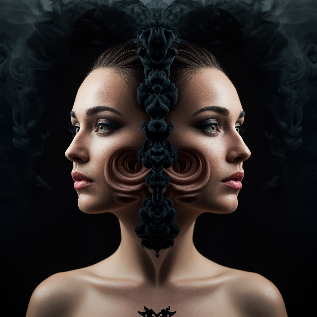 beautiful enigmatic woman amidst flowing black ink, 8k resolution, photorealistic masterpiece by Aaron Horkey and Jeremy Mann inspiration, intricately detailed fluid gouache painting reminiscent of Jean Baptiste, professional photography essence, natural and volumetric lighting, maximalist approach, concept art charm, intricately detailed, complex, elegant, expansive, fantastical narrative, striking cover art focus, dual perspectives, surreal face composition, artistic exploration of form and mutation, unusual anatomy, unexpected limbs and features, blurred boundaries between beauty and distortion, artistic reinterpretation of traditional anatomy, ethereal yet unsettling, captivatingly distorted elegance, duality of heads and faces, vibrant yet eerie, reflective of a mythical transformation, exploration of unconventional forms and visual impact.