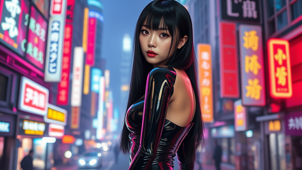 Beautiful full body shot of Reika, wearing a sleek black latex bodysuit, with straight black hair cascading down her back, set against a vibrant science fiction backdrop of a cyberpunk city. The scene draws inspiration from Gantz and Cyberpunk 2077, showcasing an ultra-realistic portrait of a stunning woman with jewel-like eyes that captivate with their intensity. The composition is a masterpiece in high-definition, with intricate details and a breathtaking cinematic quality. Neon lights illuminate the scene, casting dramatic chiaroscuro shadows that enhance the anime-inspired aesthetic. The key visual is vibrant and highly detailed, offering a vivid portrayal of a futuristic cityscape. Despite the low-resolution cinematic style, the scene maintains exceptional detail and vivid colors, capturing Reika's allure and the mesmerizing cyberpunk environment.