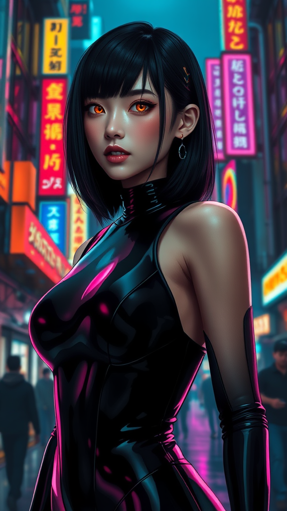 Beautiful full body shot of Reika wearing a sleek black latex bodysuit with straight black hair, set against a vibrant cyberpunk cityscape reminiscent of Gantz. In the Style of Cyberpunk 2077, the scene captures an ultra-realistic portrait of a stunning woman with jewel-like eyes glowing under neon lights. The setting is rich with chiaroscuro contrasts, showcasing a dynamic blend of anime style and cinematic visual aesthetics. Her face is intricately detailed, exuding a sense of breathtaking beauty amidst the vibrant and bustling futuristic backdrop. The overall composition is highly polished for high-definition display, with an emphasis on vibrant colors and intricate details that draw the viewer into this cybernetic world. Despite its cinematic depth, the image maintains a polished, wallpaper-ready quality free from imperfections such as pixelation, discoloration, or anatomical errors, focusing instead on showcasing Reika's masterpiece-like visage.