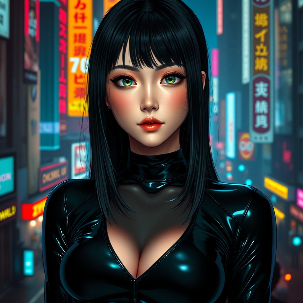 View this AI-generated image featuring beautiful full body shot of reika in a sleek black latex bodysuit her straight black hair framing her face set against a vibrant cyberpunk cityscape reminiscent of cyberpunk 2077 her face is ultra realistic and stunning with jewel like eyes that reflect the neo