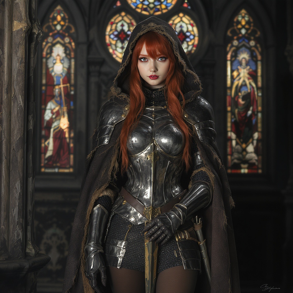 A stunningly beautiful and slender girl with an innocent and naive face, fiery red long hair, clad in the most intricately detailed and damaged full gothic knight's armor made of blued steel. She stands with tights and a short skirt, draped in a superbly detailed tattered dark brown wool cloak with a rough weave. The setting exudes a dramatic and gloomy atmosphere with a natural blued steel texture and an expressive, super-detailed background. The scene captures the golden hour's natural light, enhanced by the stained glass and colored glass lighting that creates a cinematic effect. The girl's ensemble is completed with a gold-accented corset and rivets. Her appearance includes anime-inspired eyes, conveying both purity and strength. Despite the damaged appearance of her armor, she radiates an ethereal beauty, with naked arms, neck, and hands that suggest vulnerability. The setting reflects an atmosphere of restrained elegance against a backdrop of symmetrical designs and round window-like structures. The character's expression is full of life, contrasting with the eerie and somber environment, creating a captivating contrast in hyper-realistic detail.