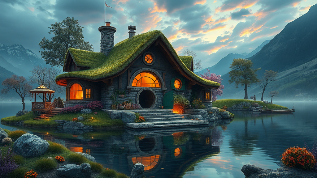 Beautiful hyperrealistic hobbit lake house, highly detailed digital painting, trending on ArtStation, concept art, illustration, cinematic lighting, vibrant colors, photorealism, epic scene, octane render, 8k resolution, UHD, HDR, immersive view, serene landscape, imaginative design, harmonious integration with nature, whimsical elements, rich textures, idyllic setting, fantasy architecture, enchanting ambiance, and seamless composition.