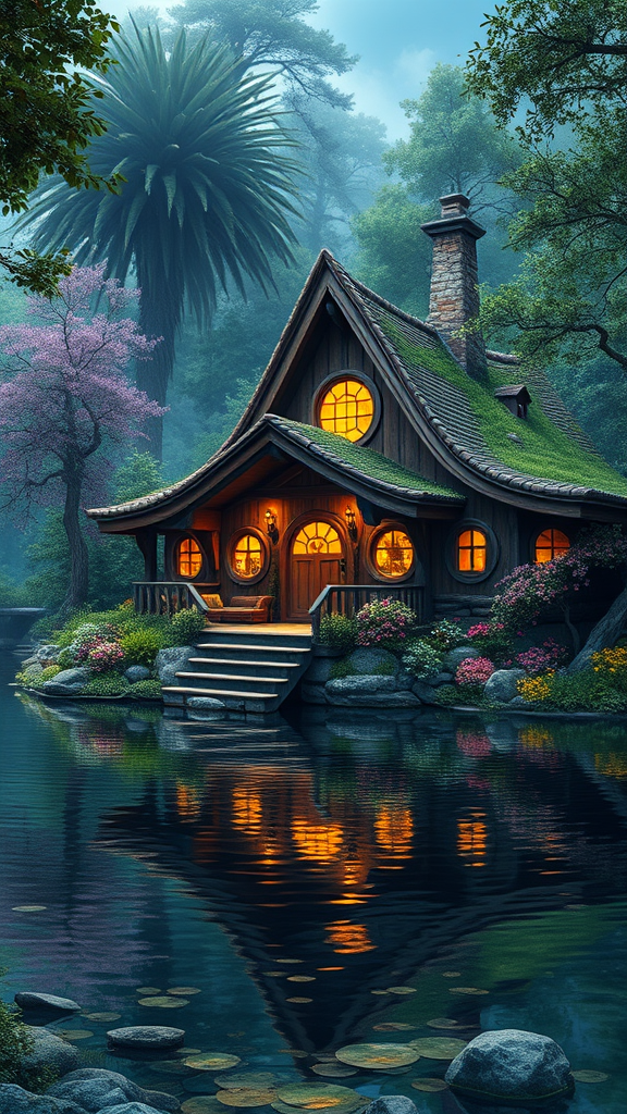 Beautiful hyperrealistic hobbit lake house, highly detailed digital painting, trending on ArtStation, concept art, illustration, cinematic lighting, vibrant colors, photorealism, epic atmosphere, rendered in octane, 8k resolution, UHD, HDR, enchanting and serene environment, picturesque and tranquil, lush greenery, cozy and whimsical design, harmoniously blending with nature, reflecting the charm of a fairy tale home, inviting and warm ambiance, captivating fantasy scenery, elegant and timeless architectural style, artistic and visually stunning masterpiece, expertly crafted with attention to detail.