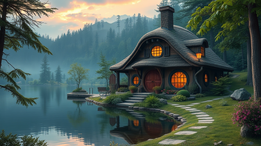 Beautiful hyperrealistic hobbit lakeside home, intricately detailed, digital painting, popular on art platforms, concept art, illustration, cinematic lighting, vivid colors, photorealistic, majestic, octane render, 8k resolution, UHD, HDR, charming design, whimsical architecture, serene environment, enchanting atmosphere, natural elements, lush greenery, tranquil water reflections, peaceful retreat, fantasy setting, dreamlike quality, captivating imagery, immersive experience.