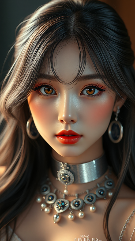 Beautiful Korean girl, kpop idol, dramatic lighting, symmetrical eyes, realistic, sharp focus, HD, highly detailed, intricate, photography, hyperrealism, raytracing, nvinkpunk jewelry, CGI, 3d, doll-like features, cartoon and anime-inspired, illustration, drawing, digital art, digital painting, emphasize precision and clarity, avoid low quality aspects like pixelation or visual errors, maintain aesthetic integrity by steering clear of distortions or unnatural forms, refined proportions, elegant and coherent anatomy, ensuring clarity with a well-balanced composition.