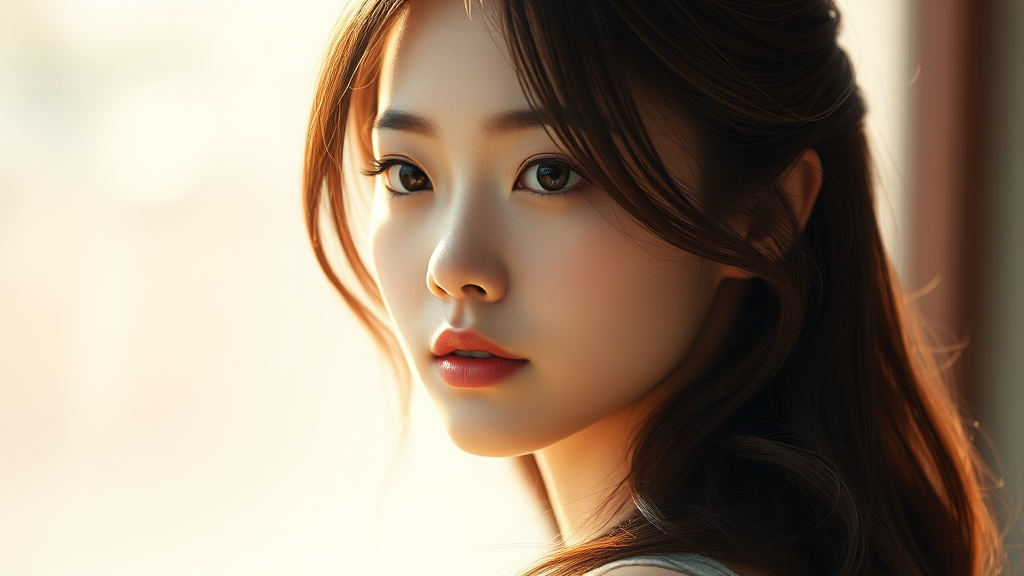 Beautiful Korean girl, surrounded by a softly blurred background with volumetric haze and global illumination, basking in natural lighting that highlights her features. The scene is depicted in an ultra-high-resolution, highly detailed color photo with a touch of CG artistry, reminiscent of an 8K wallpaper. The physics-based rendering enhances the realistic, hyperrealistic textures of her skin and hair. Captured with a f1.6 lens, the composition features rich, vibrant colors and a high-contrast, lifelike quality, evoking the visual allure of Cinestill 800 film with subtle creative elements that elevate her serene, graceful presence.
