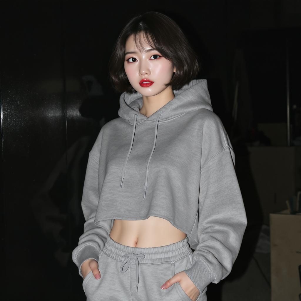 Beautiful Korean girl with a cute, loose bob hairstyle, wearing a stylish cropped hoodie and chic capri sweatpants. She has her hands casually in her pockets, accentuating her red lips and small breasts. Her toned stomach is subtly revealed, and her long eyelashes highlight her aegyo sal. Captured in dramatic lighting, the photography conveys an artistic and captivating essence.