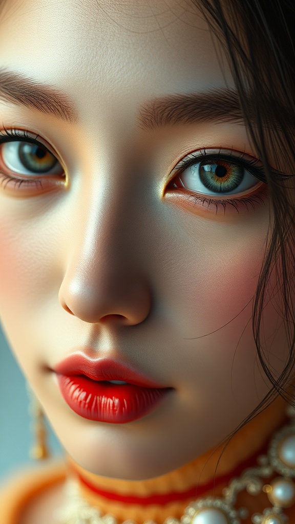 View this AI-generated image featuring beautiful korean woman kpop idol featuring symmetrical eyes with realistic detailed eyes in sharp focus emphasizing hyperrealism with intricate detail presented in 8k uhd resolution captured as a high detail raw color photo with inspiration from highly detailed