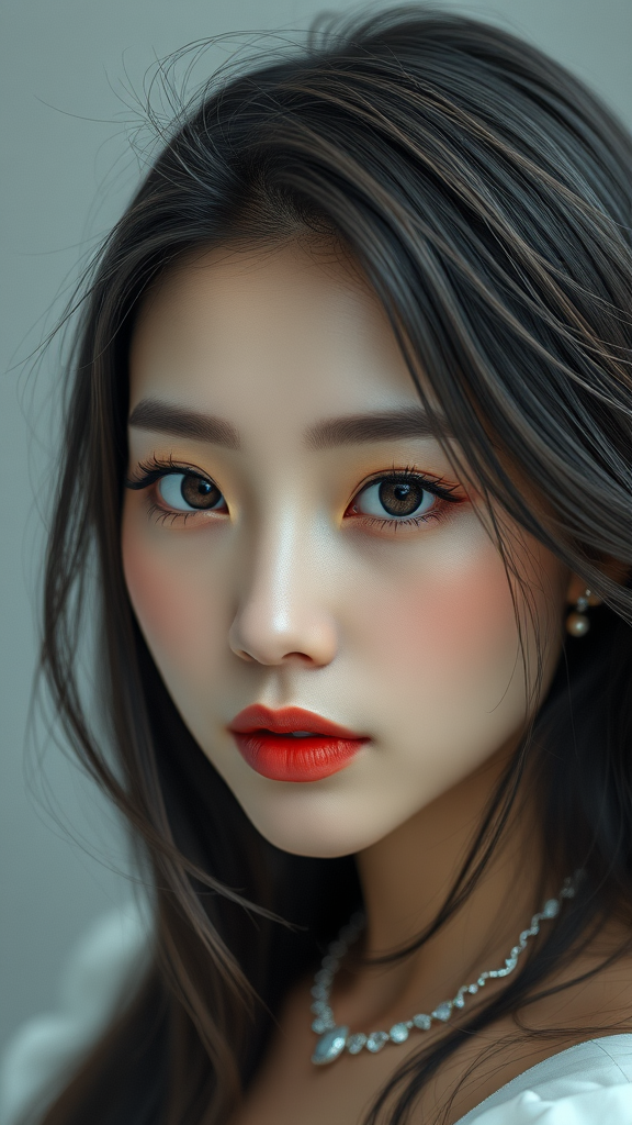 Beautiful Korean woman as a K-pop idol with symmetrical eyes captured in 8k ultra-high-resolution hyperrealism photography. Her face and eyes are intricately detailed, resembling a high-detail color photo taken professionally. The image employs ultra-high resolution with a focus on physics-based rendering, showcasing realism and high contrast in 8k HD. The detailed, best-quality visual is reminiscent of images captured by a Nikon D850 on Cinestill 800 film, highlighting jewelry details. Incorporating elements of CGI, the depiction blends the essence of a 3D doll with the style of cartoon and anime. It's an illustration and digital painting with attention to detail, capturing the essence of beauty despite natural skin spots, minor acne, and subtle blemishes, all contributing to its realistic charm.