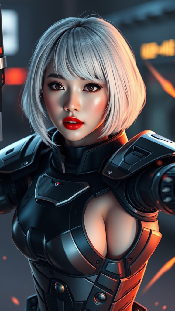 Beautiful Korean woman in a dynamic action scene, kpop idol aura, clad in sleek Mass Effect-inspired armor, sporting striking white hair with a cute loose bob hairstyle. Her red lips contrasting elegantly with her small breasts and toned physique under dramatic lighting. Rendered in ultra-high resolution with physics-based rendering, adding an extra layer of realism and intensity to the scene.