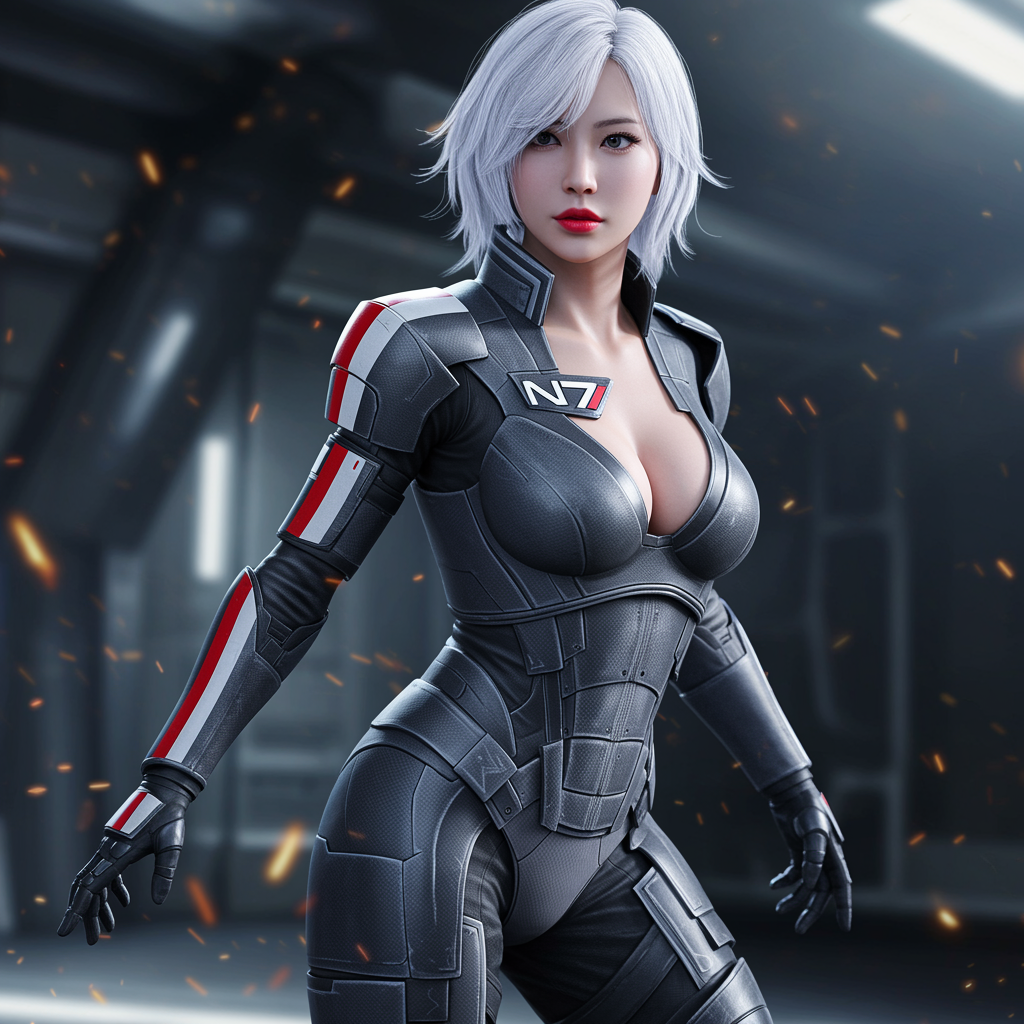 Beautiful Korean woman in a high-energy action scene, striking a dynamic pose, reminiscent of a K-pop idol. She is clad in sleek, futuristic Mass Effect armor, her hair a striking white in a cute loose bob style. Her red lips add a pop of color to her serene yet fierce expression. With a toned physique and small breasts, she stands strong in the midst of dramatic lighting that casts intriguing shadows and highlights. The scene captures ultra-high resolution detail with physics-based rendering that enhances the texture and realism of the armor and surroundings.