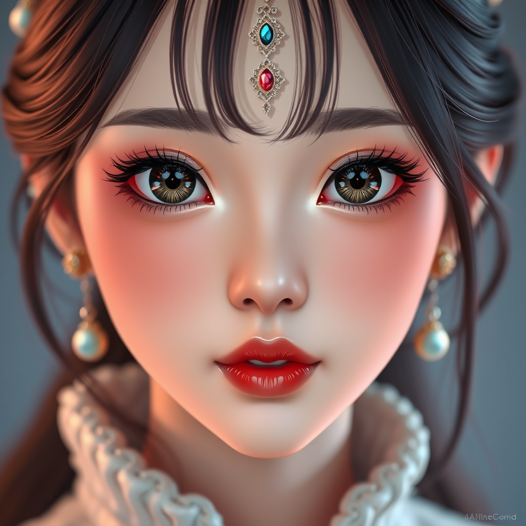 Beautiful Korean woman, K-pop icon, symmetrical eyes, ultra high-resolution, hyperrealistic, dramatic lighting, exquisite facial details, intricately detailed eyes with jewelry, ornate buttons, CGI, 3D, doll-like features, octane render, a blend of cartoon and anime styles, illustration, digital painting, vibrant colors, slight text overlay, cropped composition, subtle JPEG artifacts.