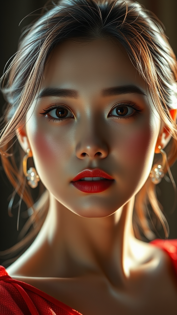 Beautiful Korean woman, K-pop idol, dramatic lighting, high detail RAW color photo, realistic, ultra-high resolution, physics-based rendering, masterpiece, high contrast, 8k HD, hyper-detailed, best quality, vibrant colors, cinematic lighting, professional photography, f1.6 lens, photorealistic, aesthetically pleasing, artistic, CGI influences, digital artistry, seamless blend of realism and creativity, focus on facial features, rich texture, smooth finish, elimination of imperfections, graceful posture, captivating expression, elegance, harmonious composition.