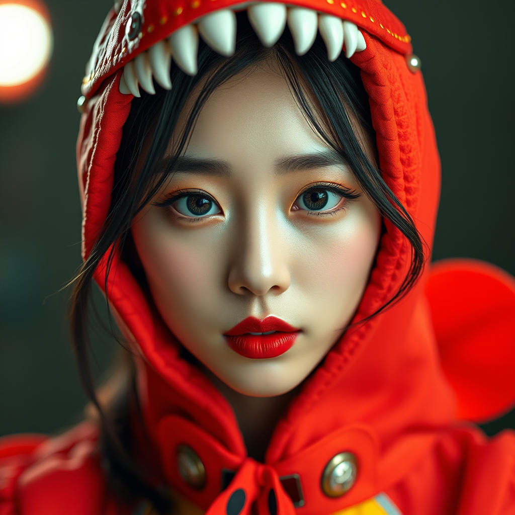 Beautiful Korean woman, K-pop idol, dressed in a colorful dinosaur costume, featuring symmetrical eyes, ultra high-res, photorealistic in 8k with hyperrealism and dramatic studio lighting, capturing the essence of photography. She wears soft red lipstick and intricate jewelry, blending a touch of fashion with playful charm. Enhanced with CGI elements, the scene integrates 3D, doll-like features rendered in Octane with a cartoon and anime influence. Illustrated as a digital painting, the art combines elements of drawing with subtle text effects. The composition is cropped, adding an artistic flair, with slight JPEG artifacts for texture. Accessories include a stylish tie and decorative buttons, set against a theme of bold and vibrant red.