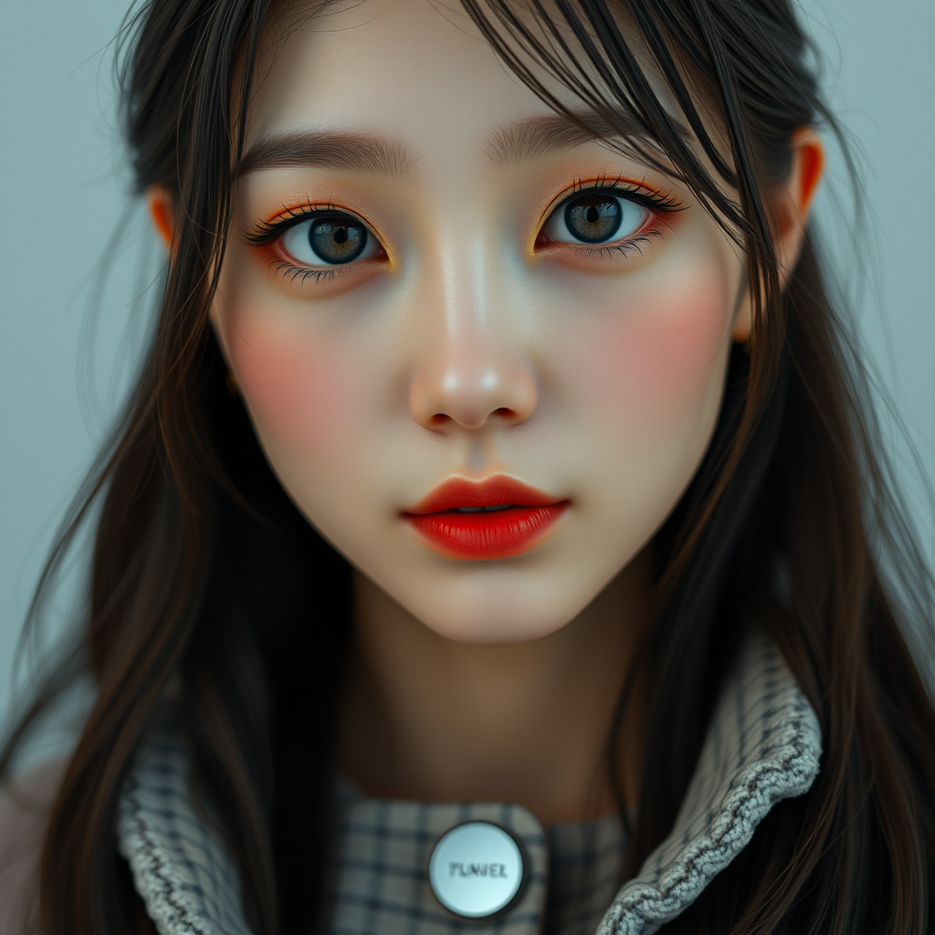 Beautiful Korean woman, K-pop idol, symmetrical eyes, 8k ultra high-res hyperrealism, photography, exquisitely detailed face, captivating eyes, high detail color photo, professional image, ultra-high resolution, physics-based rendering, photorealism, high contrast, 8k HD high definition detailed realistic, premium quality, Nikon D850 film, Cinestill 800, buttons, CGI, 3D, doll-like features, anime influence, digital art, stunning illustration, intricate digital painting, smooth skin, perfect anatomy.