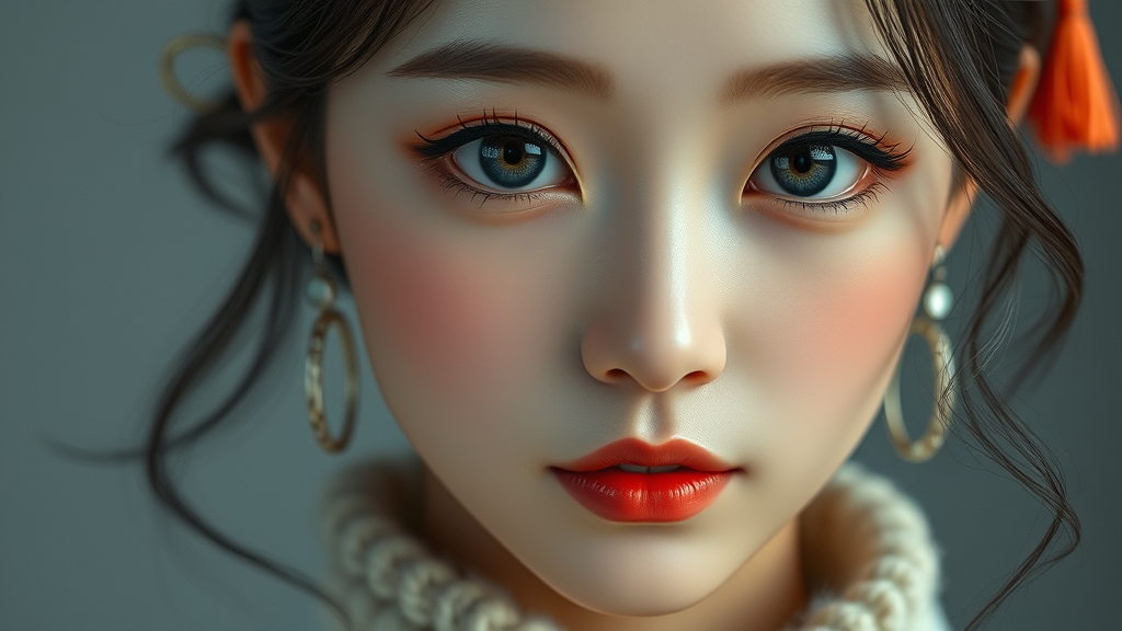 Beautiful Korean woman, K-pop idol, symmetrical eyes, ultra-high resolution, hyperrealism, high detail, professional photography, beautifully detailed face, captivating eyes, high contrast, 8k HD definition, best quality, Nikon d850 film, finely detailed jewelry, realistic buttons, CGI elements, 3D artistry, doll-like features, anime-inspired illustration, digital painting, realistic textures, enhanced color, cinematic feel, flawless skin, accurate anatomy.