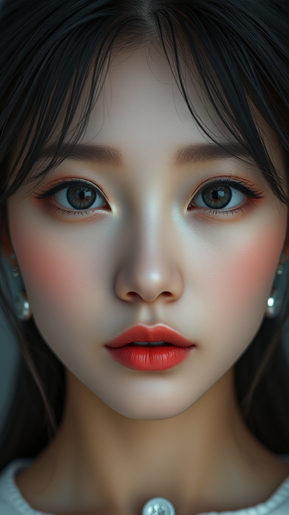 Beautiful Korean woman, K-pop idol, symmetrical eyes, 8k, ultra high-resolution, hyperrealism, photography, exquisitely detailed face, captivating detailed eyes, high detail color photo, professional photo, ultra-high resolution, physics-based rendering, realism, high contrast, 8k HD high definition detailed realistic, premium quality, captured with Nikon d850 film, cinestill 800 jewelry, buttons, CGI elements, 3D influence, doll-like features, anime and illustration style, digital art, digital painting, high clarity, jpeg artifacts free, flawless skin, impeccable anatomy.