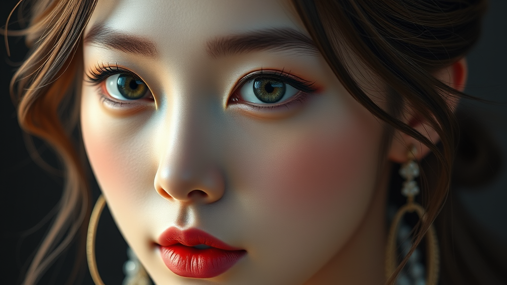 Beautiful Korean woman, K-pop idol, symmetrical eyes, realistic, sharp focus, HD, highly detailed, intricate, photographic quality, hyperrealism, studio portrait, dramatic lighting, adorned with jewelry, CGI-inspired, creative blend of 3D and illustration, anime-influenced, digital art, expressive drawing, sophisticated digital painting, avoiding low resolution, text errors, cropped images, and maintaining high quality.