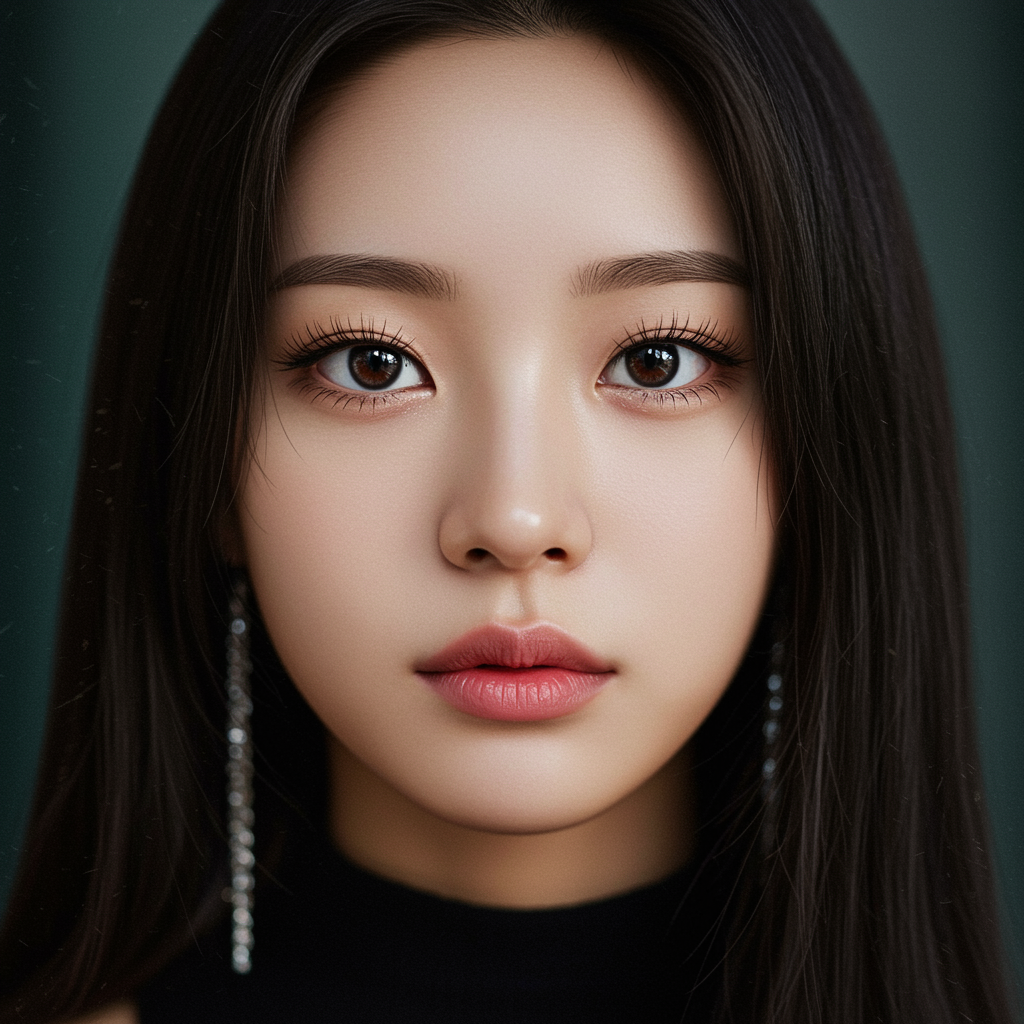Beautiful Korean woman, K-pop idol, symmetrical eyes, ultra-high-resolution, hyperrealism, photography, exquisitely detailed face, captivating eyes, high-detail color photo, professional photography, top-tier quality, Nikon D850 film, cinematic jewelry, CGI, 3D model, anime-inspired style, digital art, digital painting, textural elements, cropped perspective, realism, high contrast, 8k HD definition with detailed accuracy, illustration, drawing, subtle skin variations, natural complexion.