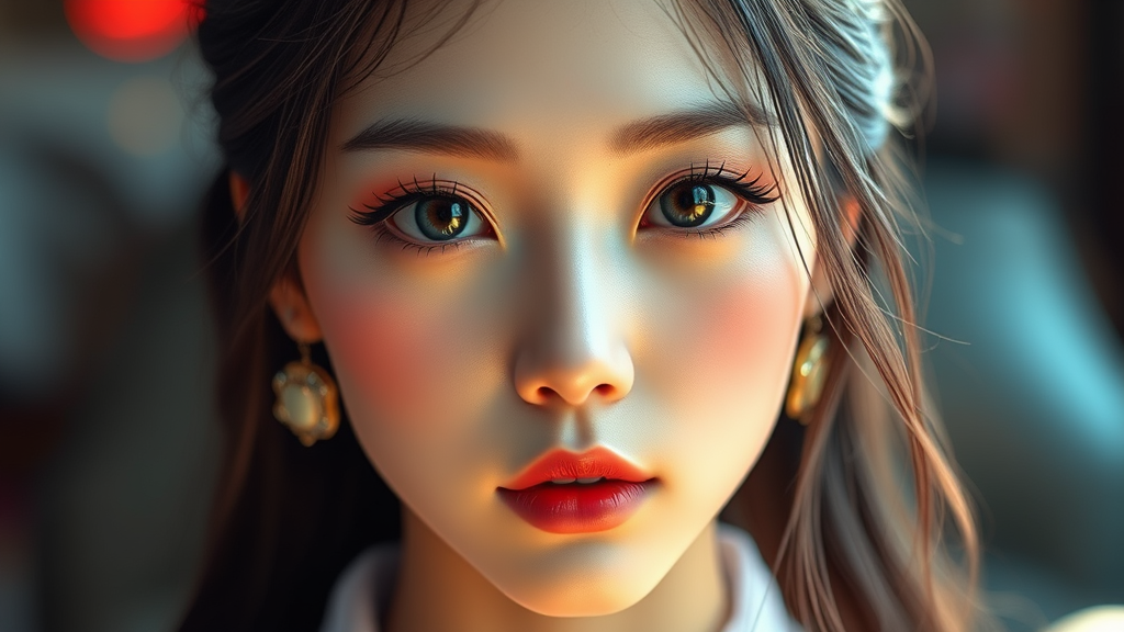 Beautiful Korean woman, K-pop idol, symmetrical features, 8k resolution, ultra high-definition, hyper-realistic aesthetic, dramatic lighting, intricate facial details, striking eyes with jewelry accents, buttons, CGI-inspired design, 3D doll-like quality, octane render style, cartoon and anime influences, illustration and digital painting elements, vibrant and dynamic, detailed textures, textural depth, slight jpeg artifacts.