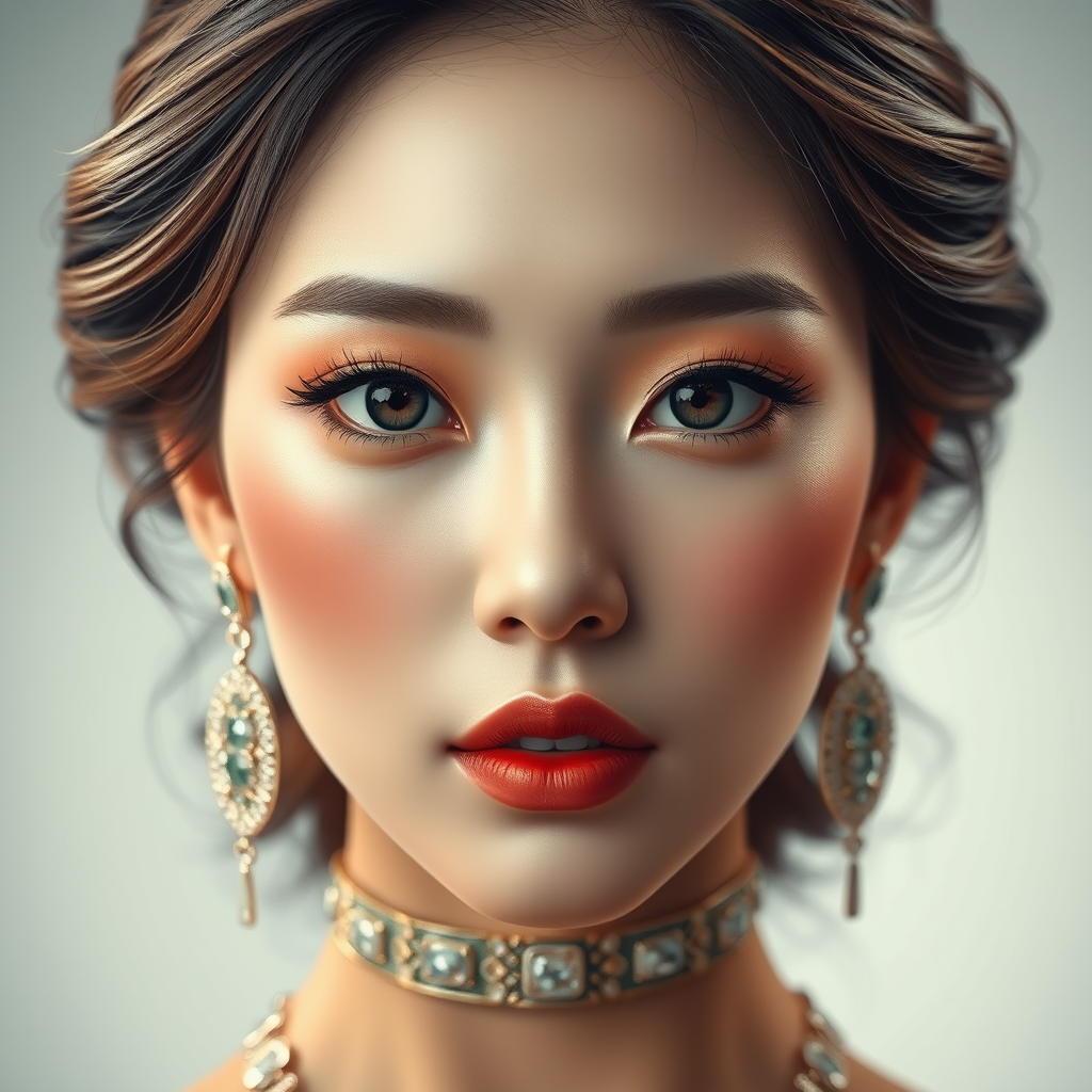 Beautiful Korean woman, K-pop star, symmetrical facial features, realistic, sharp focus, HD, highly detailed, intricate photography, hyperrealism, studio portrait, dramatic lighting, elegant jewelry, cgi-inspired, 3D effect, doll-like qualities, cartoon influence, anime-inspired, illustration, digital painting, note of artistic flair. Avoid low resolution, text errors, cropped images, low quality artifacts, avoid overly manipulated results, ensure natural anatomy and proportions, maintain focus on beauty and detail.