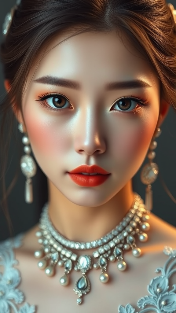 Beautiful Korean woman, kpop idol, striking symmetrical eyes, realistic sharp focus, HD, highly detailed and intricate photography, hyperrealistic studio portrait, dramatic lighting, adorned with elegant jewelry, stunning cgi elements, a blend of 3d art and doll-like features, slight cartoon and anime influence, exquisite illustration and digital painting, vibrant and glossy finish, careful attention to anatomy and proportions, enhanced features with a captivating expression.