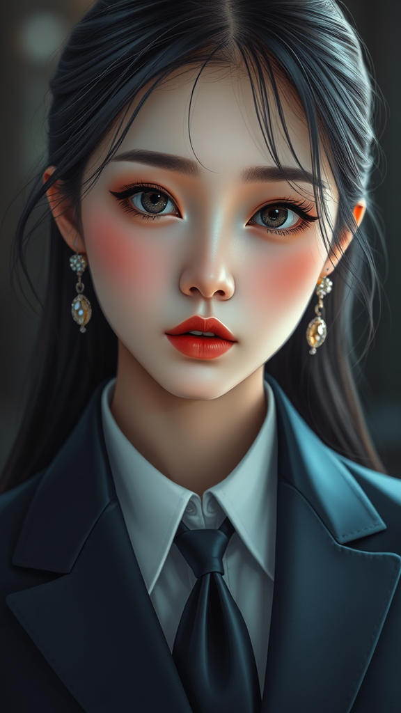 Beautiful Korean woman, kpop idol, symmetrical features, ultra high resolution, photorealistic, hyperrealism, dramatic lighting, exquisite jewelry, CGI-inspired, 3D model-like, doll-like appearance, octane render, fusion of cartoon and anime style, intricate illustration, digital painting, detailed photography, subtle textural elements, vibrant colors, cropped composition, subtle jpeg textures, formal attire with tie and buttons, elevated artistry, smooth elegance.