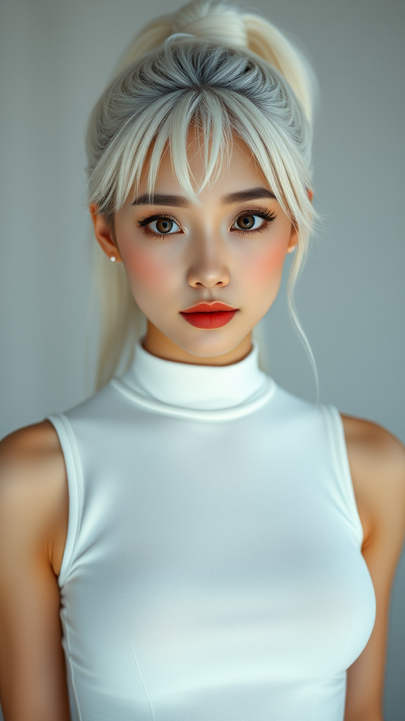Beautiful Korean woman, kpop idol, white hair, ponytail, symmetrical eyes, tight all-white sleeveless bodysuit, red lips, small breasts, olive skin tone, eyelashes, aegyo sal, Nikon, D850 film, photograph, Kodak Portra 400, camera f/1.6 lens, rich colors, dramatic lighting, Cinestill 800, 8k, RAW photo, masterpiece, high detail RAW color photo, professional photo, ultra high resolution, highly detailed CG unified 8K wallpapers, physics-based rendering, realistic photo, high contrast, 8k HD high definition detailed, CGI, 3D, detailed digital art, digital painting, illustration, rich textures, vivid hues, intricate design, impeccable symmetry, captivating expression, lifelike rendering, expertly composed, dynamic lighting, artistic elegance.
