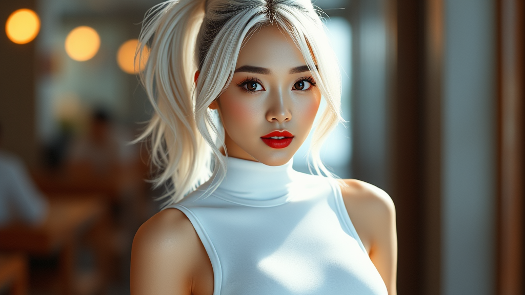Beautiful Korean woman, kpop idol, white hair styled in a ponytail, symmetrical eyes, wearing a tight all-white sleeveless bodysuit, red lips, small breasts, olive skin tone enhanced with eyelashes and aegyo sal. Captured with a Nikon D850 using Kodak Portra 400 film, utilizing a camera with an f1.6 lens. Rich colors and dramatic lighting evoke a cinestill 800 effect, resulting in an 8k ultra high resolution, highly detailed RAW photograph. Professional-grade photo with CG elements, exhibiting high contrast and realism. Rendered with physics-based techniques, this masterpiece features anime-inspired characteristics with digital art precision, avoiding attributes such as low quality or unrealistic features, maintaining perfect anatomy and aesthetic proportions.
