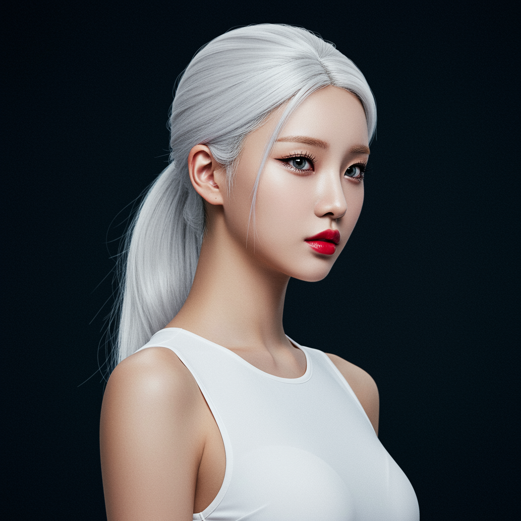 Beautiful Korean woman kpop idol with striking white hair styled in a sleek ponytail, showcasing perfectly symmetrical eyes and wearing a form-fitting, all-white sleeveless bodysuit. Her lips are vibrant red, and she possesses a subtly toned body with small breasts and an olive skin tone. Her features are enhanced by long eyelashes and aegyo sal. Photographed using a Nikon D850 on Kodak Portra 400 film with a f1.6 lens, this stunning image captures rich colors and dramatic lighting. The look is reminiscent of a masterful high-detail RAW photo, rendered in ultra-high resolution with a professional finish. The image exudes the quality of highly detailed CGI, utilizing physics-based rendering to achieve a near-perfect appearance. With an 8K HD quality, the astonishing realism maintains a seamless blend of artistic elegance, making it ideal for wallpapers. The balance of 3D rendering and digital art ensures an impeccably detailed depiction that is visually captivating, embodying a mesmerizing fusion of form and color.