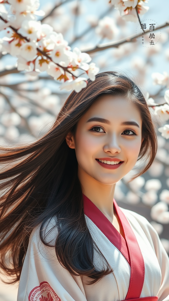 Beautiful Korean woman with a graceful elegance, captivating smile, radiant skin, flowing dark hair, bright expressive eyes, dressed in stylish traditional attire, exuding confidence, surrounded by blooming cherry blossoms, serene background, gentle breeze, natural light enhancing her features, embodying timeless beauty and cultural richness, poised with quiet strength and charm.