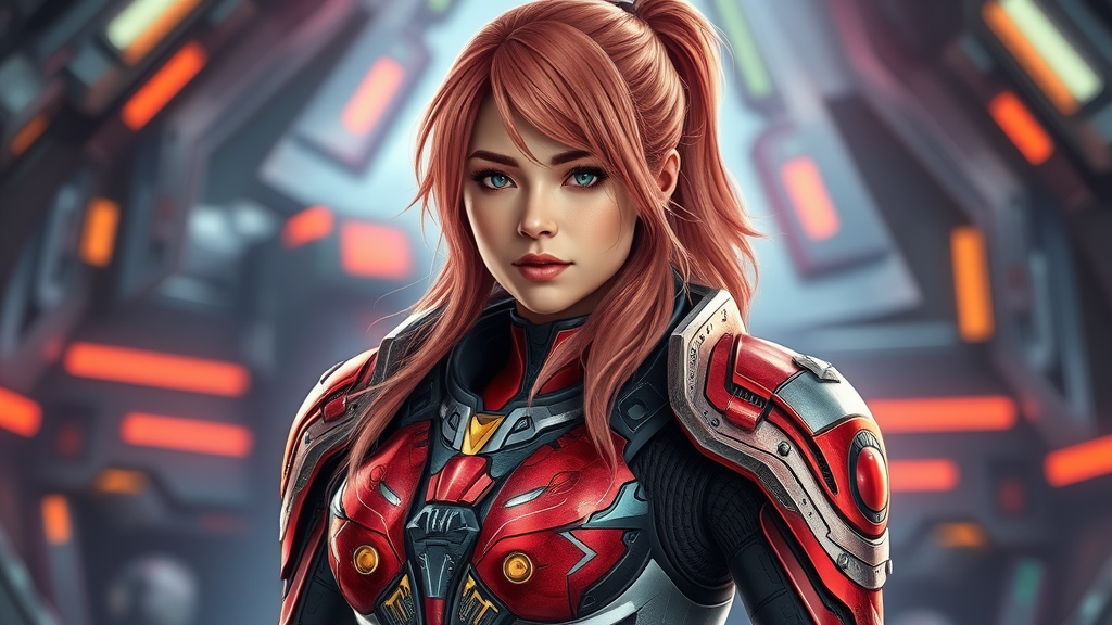 Beautiful lifelike portrait of Asuka Langley in intricate sci-fi armor, set against a futuristic backdrop, emphasizing detailed textures and a dynamic pose, conveying strength and elegance, with a focus on vibrant colors and realistic lighting.
