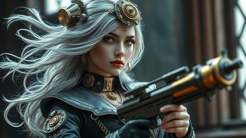 View this AI-generated image featuring a stunningly beautiful steampunk woman with flowing silver hair adorned in an intricately designed steampunk outfit equipped with a unique and elegant weapon captured in hyperrealistic detail the image is photorealistic rendered in ultra high definition 8k reso