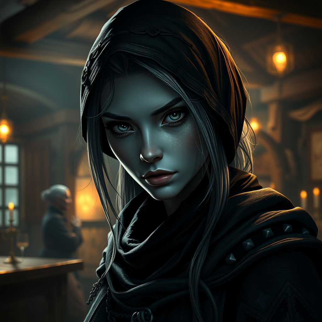 Beautiful thief from the D&D Circle of Stars, a remarkable female Drow with perfect eyes and gray skin, her full-body character portrait captured in a digital artwork. She stands in a Medieval Tavern setting, enveloped in moody, dramatic lighting, characteristic of dark fantasy. Her face is depicted with detailed realism, emphasizing her enigmatic allure. The scene is rendered in 8k UHD HDR quality, enhancing the depth and texture of her surroundings. Despite her charm, subtle hints of her secret life as a rogue are seen in the way she skillfully blends into the tavern's shadowy corners, leaving a lingering air of mystery. The image avoids any visual distortions, presenting a single, cohesive portrayal free of duplications, mutations, or distracting artifacts, offering a seamless and immersive view into this fantasy world.