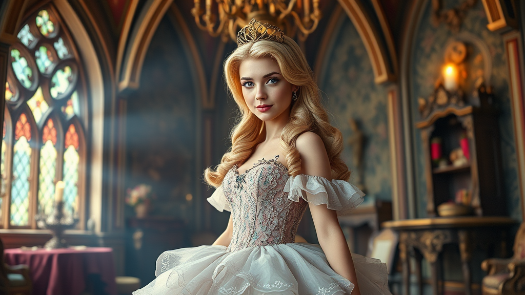 Beautiful vintage fairytale art, featuring intricate details, cinematic lighting, and detailed shadow. A colorful scene set in a spire room with a single princess character, showcasing a beautifully detailed face and elegant blonde hair. She is wearing an elaborate indoor ballgown, captured in a full-body shot in UHD, HDR, and 8K resolution. The ambiance evokes a magical, aesthetic charm, presenting the princess as graceful and captivating within her fantasy setting. Avoiding elements such as duplicates, distortions, blurriness, and any graphical imperfections to maintain a pristine and immersive visual experience.