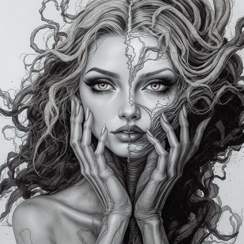 Beautiful woman, intricate black ink flow, 8k resolution, photorealistic masterpiece inspired by Aaron Horkey and Jeremy Mann, featuring the detailed fluidity of gouache painting reminiscent of Jean Baptiste. Captured with the essence of professional photography and natural, volumetric lighting. This maximalist concept art presents an elegant and fantastical vision, with expansive details that push the boundaries of traditional beauty. The composition plays with two faces, offering a duality of expression, while introducing subtle and intriguing mutations. Hands, while exquisitely detailed, carry an air of the surreal—suggestive of extra or fused fingers. There’s an intentional play on anatomy and proportions, creating a dreamlike, otherworldly aesthetic. Extra limbs and elongated necks enhance the fantastical aspect, pushing it beyond conventional beauty into a realm of wondrous imagination. Despite the intentional distortions, the piece remains a visually captivating and expansive artwork, inviting viewers to explore its complex layers and intricate details.